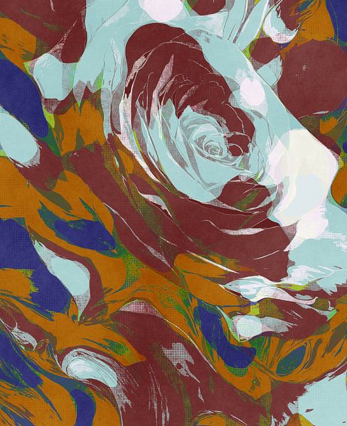 An enchanting Pop Art portrait in vibrant colours, centred on a young woman with fiery red locks and bright blue…
