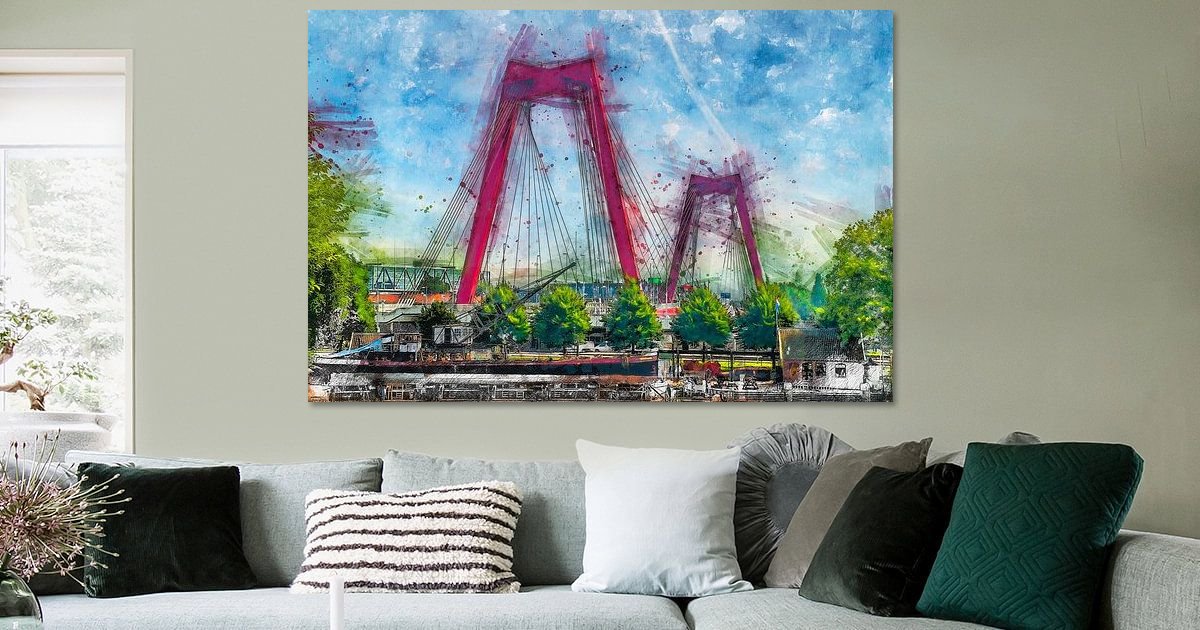 This work starring the Rotterdam Willemsbrug is a mix of photography, oil paint, sketch and watercolor creating a playful, colorful…