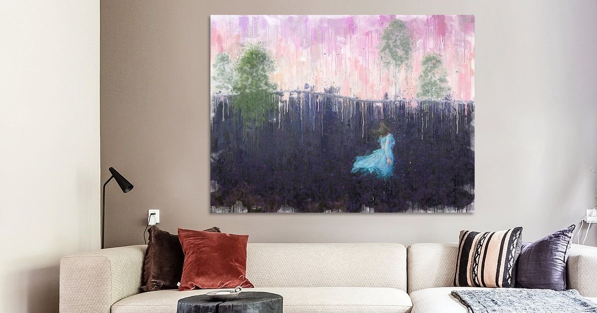 “Woman in blue dress across the blooming heather” is a stunning painting that captures the serene beauty of nature in…