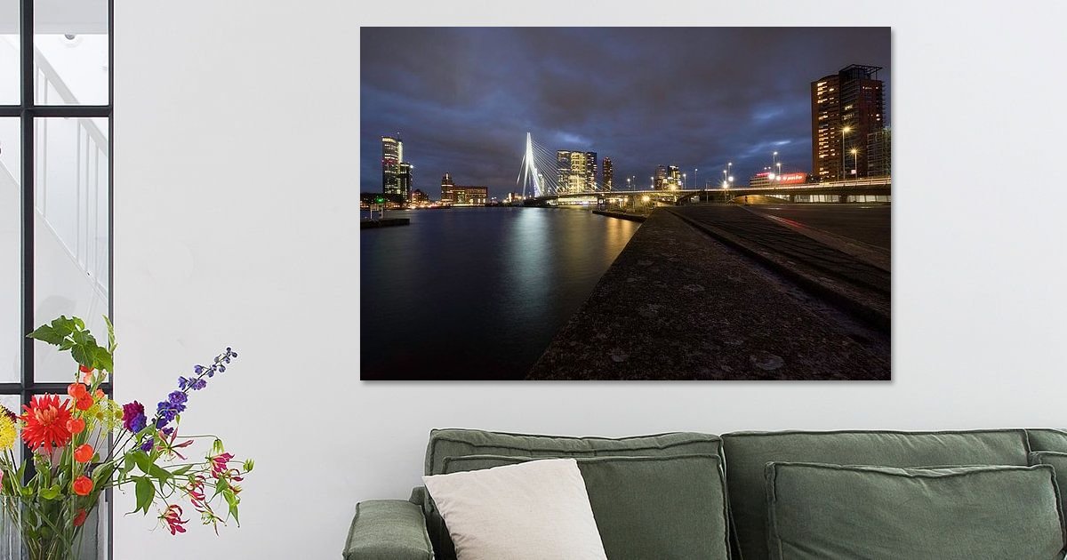 A cityscape of Rotterdam in the evening when the sun has just set towards the Kop van Zuid photographed with…