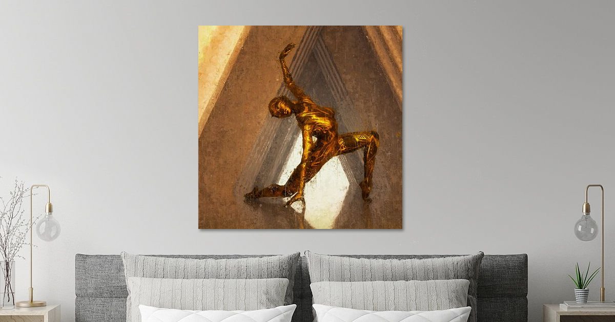 We see a gold-leafed dancer in a modern dance pose in an abstract and even slightly futuristic-looking environment. The line…