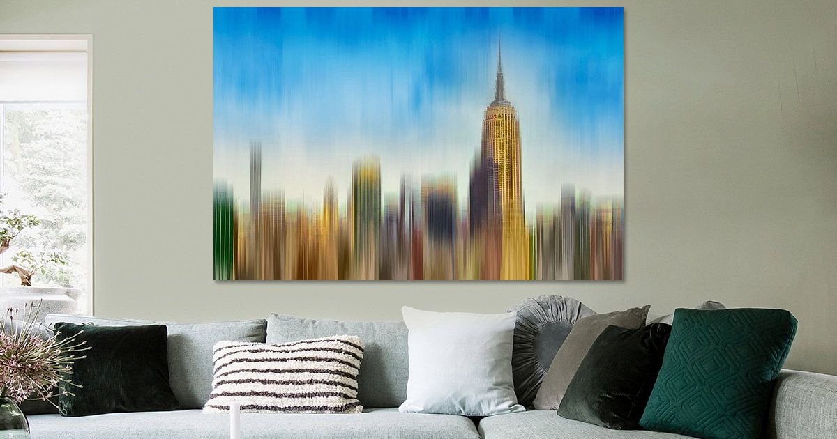An abstract work of the skyline of Manhattan in New York with the Empire State Building as the only building…