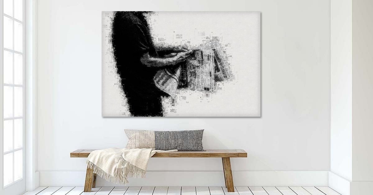 “Following the news” is an intriguing black-and-white work composed of newspaper clippings and an image of a man reading the…
