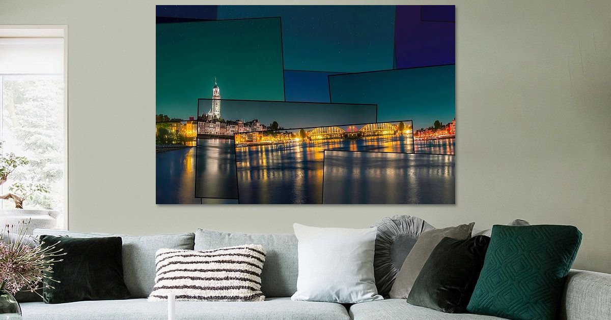 An artistic rendering in collage of the illuminated skyline of Deventer late at night.Based on long shutter time exposures photographed…