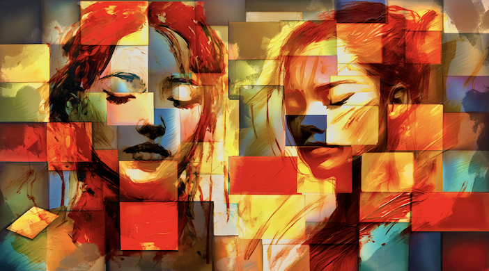 A complex mosaic that reveals the intricacies of identity through the portrayal of female figures in a geometric dance.