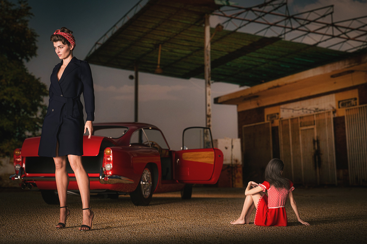 The deserted setting, the classic red car, and the two figures — the strong, standing woman and the girl in the red dress — evoke a feeling of estrangement. Their poses are deliberately exaggerated, giving the scene a narrative, almost cinematic quality.