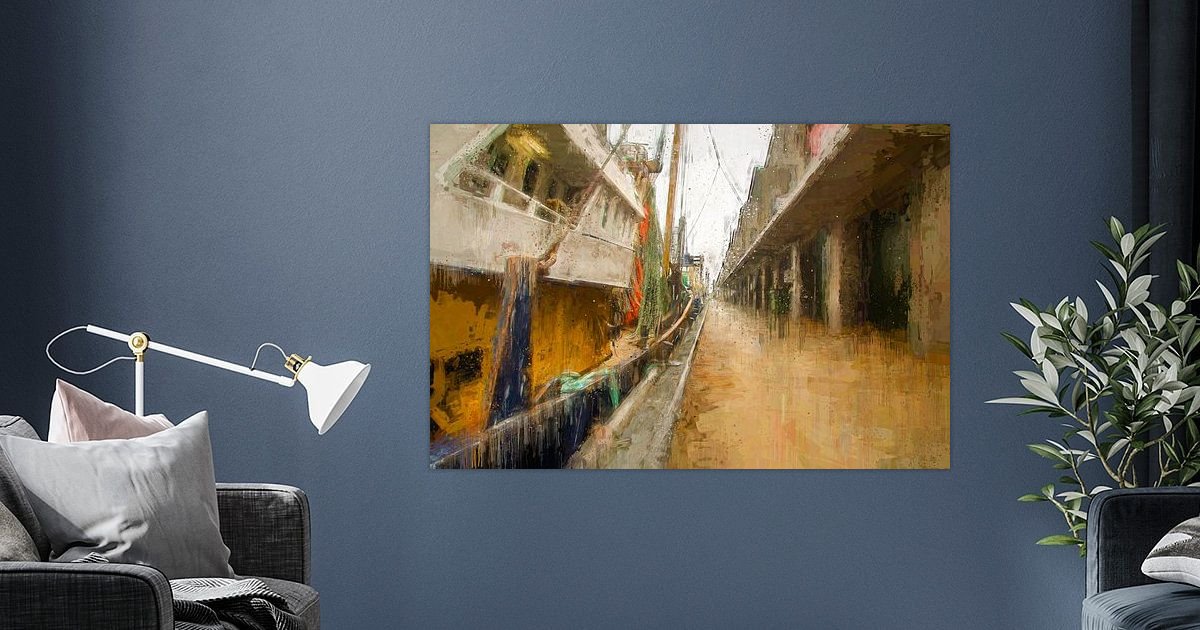 A digital painting of a Scheveningen quay with many fishing boats moored at it. This is where the fresh fish…