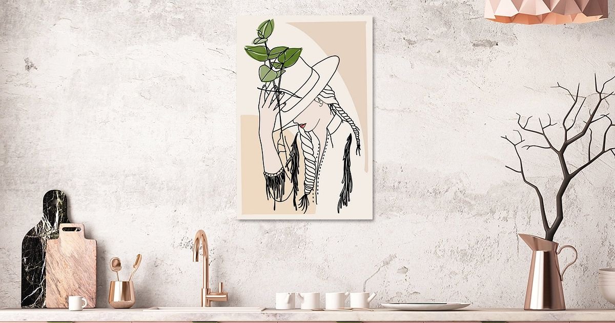 An illustration of a young woman with flowers and a hat through which her face is partially shielded. The color…