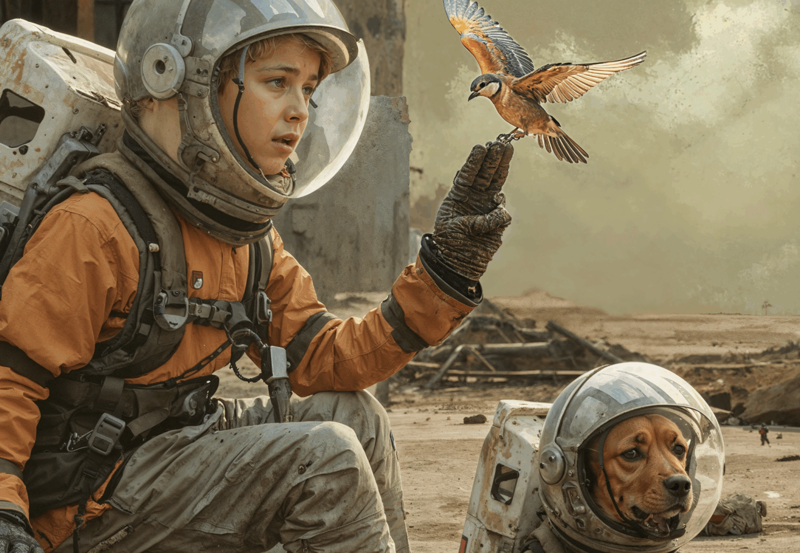 His loyal dog by his side, both wrapped in repurposed dream: astronaut suits.